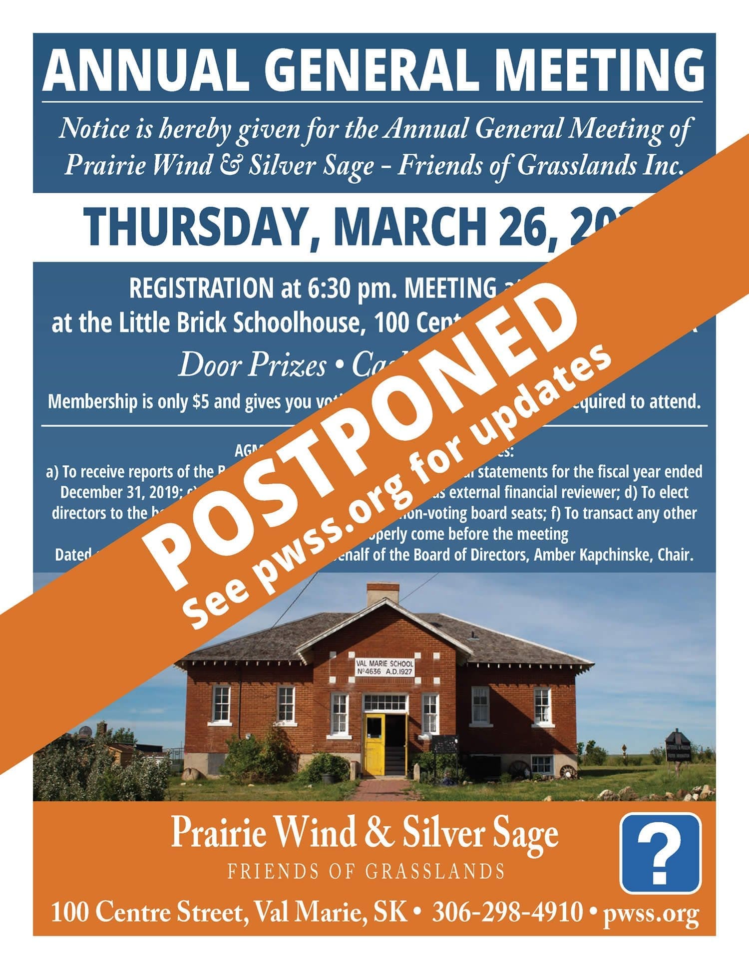 In consultation with the Board of Directors, and in following recommendations from health authorities, we are postponing the PWSS AGM, which was scheduled for Thursday, March 26.